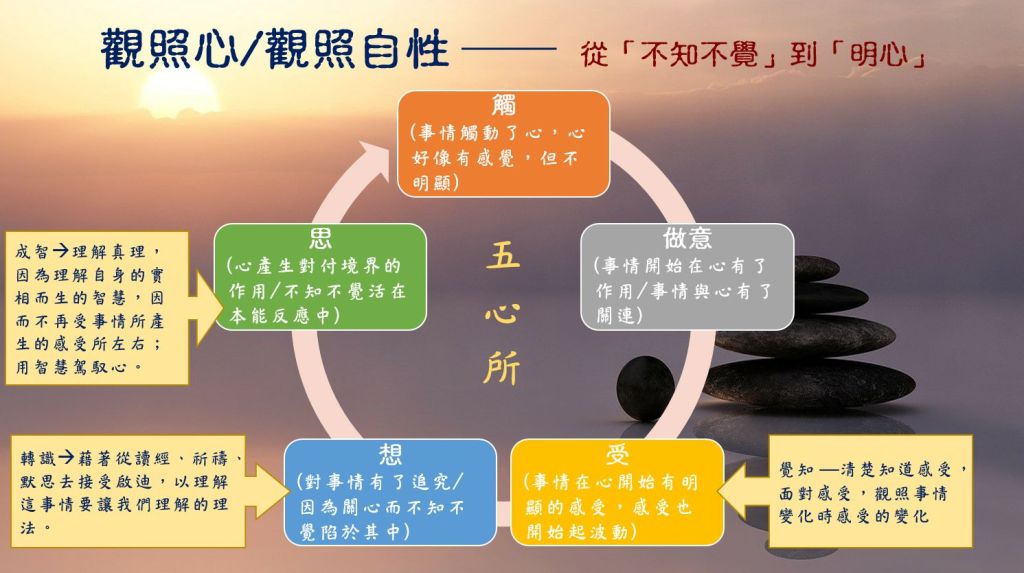 四、明心,藉由覺知了「感受」,我們認識了自然本能的反應是對感受的喜好與厭惡反應;覺知「想」,知道心在追究的是什麼,認識了其中有自我與世俗價值觀在作祟,再來就是覺知「思」的部分: 我們要如何讓心從對付境界的狀態,轉為認知、理解、而接受的狀態。
