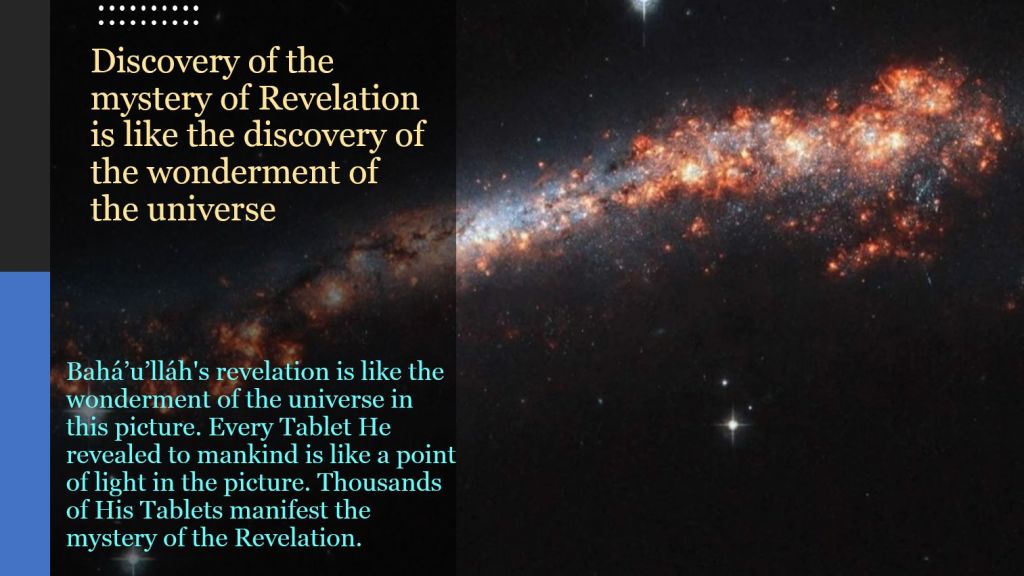 When a truth seeker understands one of the Tablet, it lights up his heart and “mirrors” out that part of the mystery in his heart. The more of the Revelation he understands, the more parts of the mystery of revelation will be reflected. He must strive day by day, until one day, the City of God will be manifest to him. He will testify the splendors of Him, Who is the King of Names, and “see” the glory of the City, the New Jerusalem.